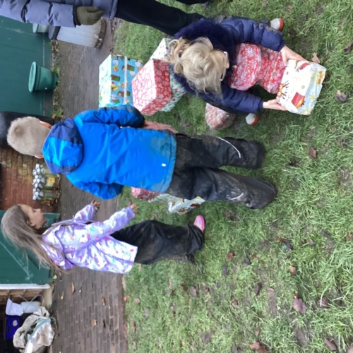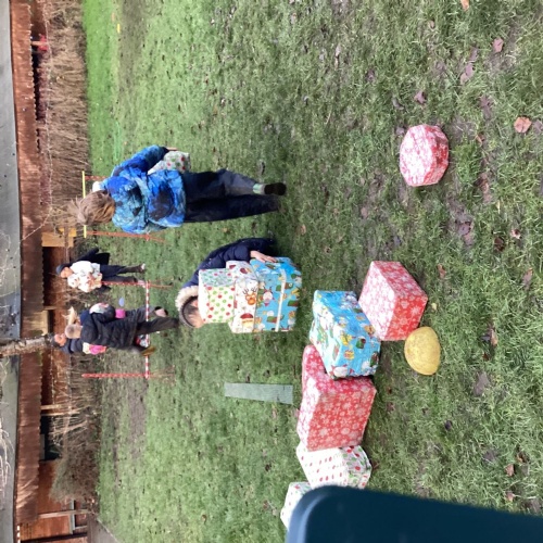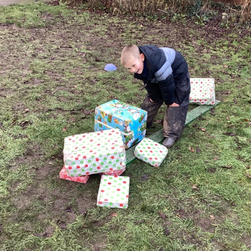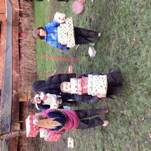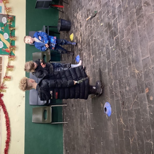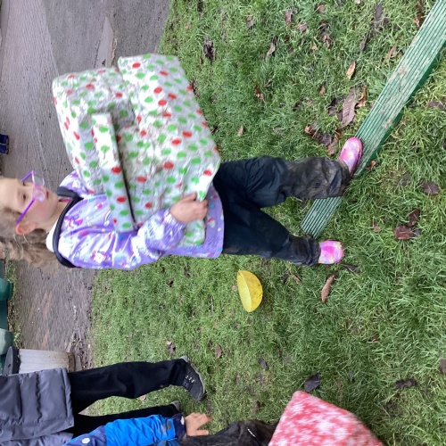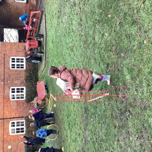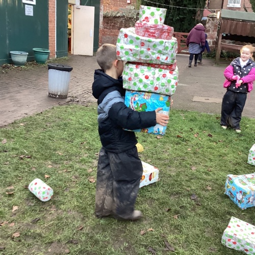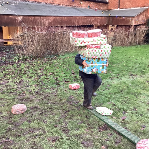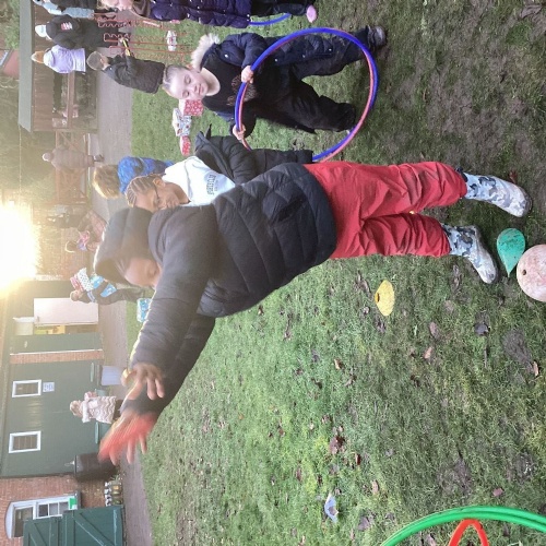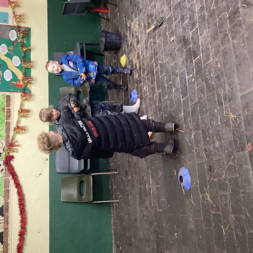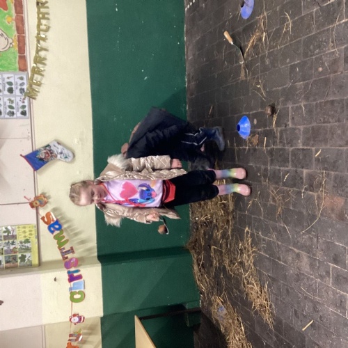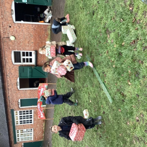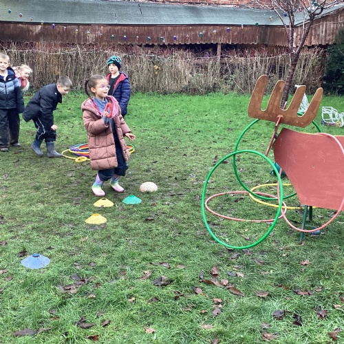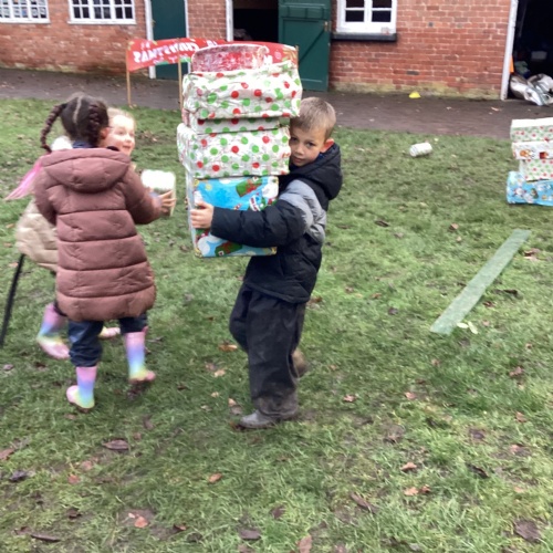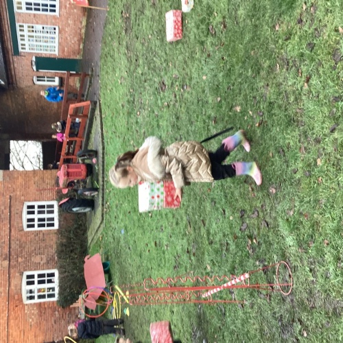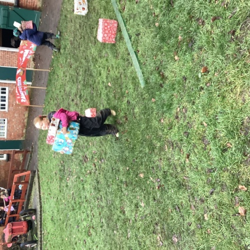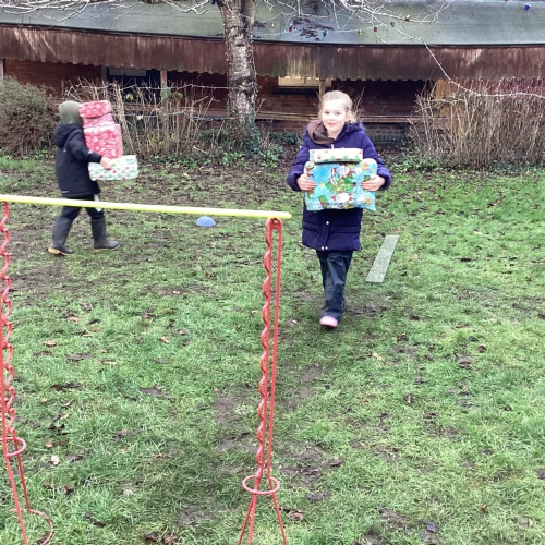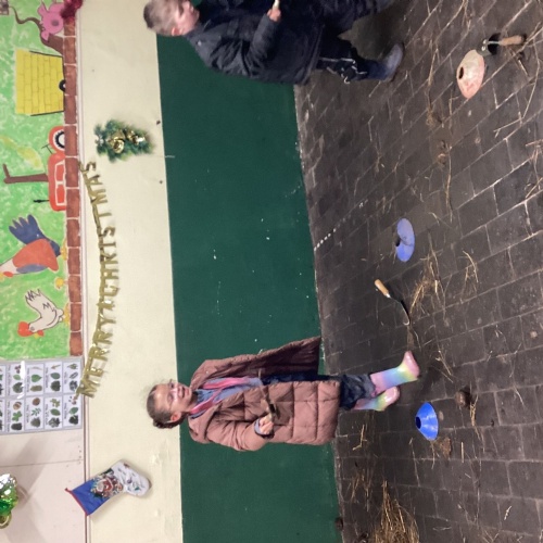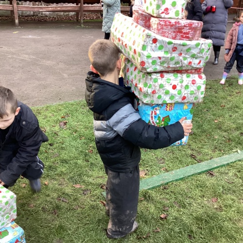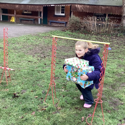The children took part in a range of festive challenges designed to test their skills. They carried presents over and under obstacles, shovelled reindeer poo, and carefully lowered presents down a chimney using a grabber tool. They also practised hooking hoops around the reindeer’s antlers, throwing snowballs into the snowman’s mouth, and carefully carrying a tray of food and milk around a tricky track without spilling a drop. Everyone showed great teamwork, determination, and festive spirit throughout the activities.