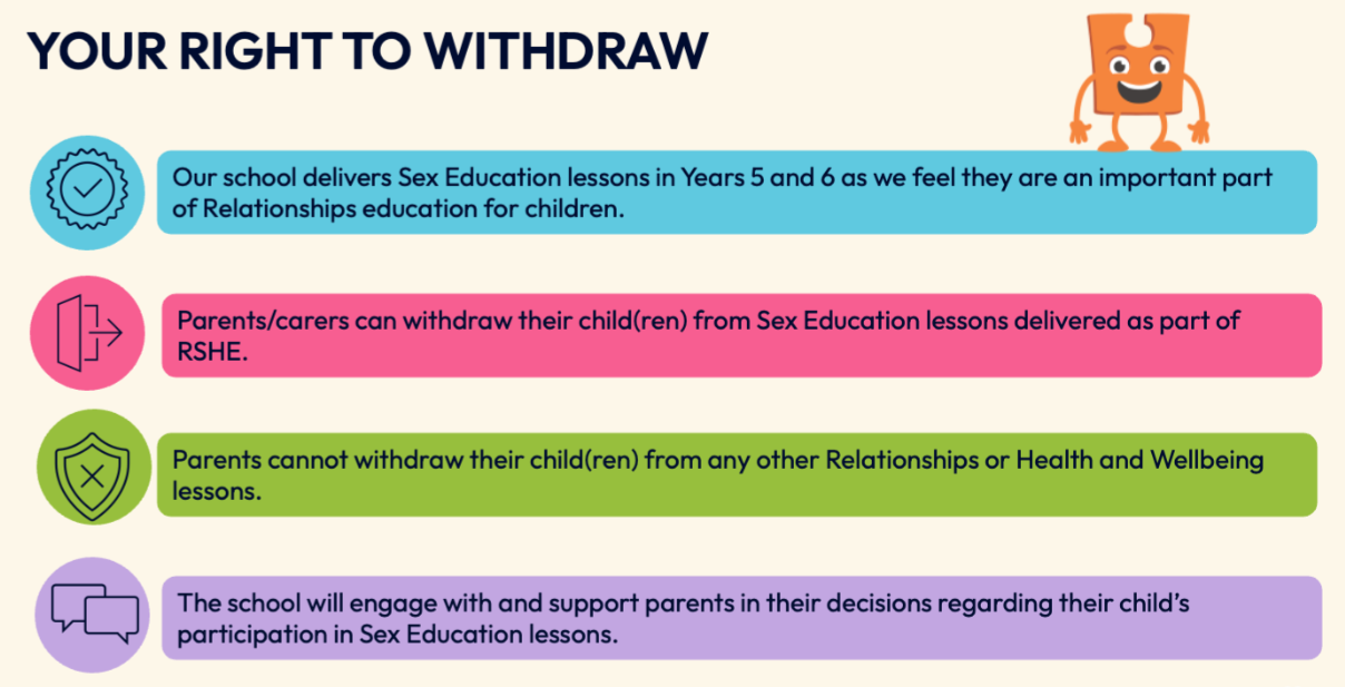 Should you wish to make a withdrawal, please request this via your child's class teacher or Mr Weaver. Your request will be logged on CPOMS (a system that allows us to record, share and track concerns and incidents) where a decision will be made and you will be notified accordingly. We will only refuse withdrawals (or discuss these with you further) when the lessons fall outside of those considered 'sex education', such as relationships or health and wellbeing lessons.